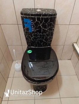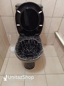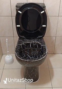 Унитаз Кировская Керамика Rosa Уют Черный Кракелюр Косой выпуск. Выполнен из санфарфора. Чаша овальной формы, смыв 2-х режимный (3 и 6 литра). В комплекте сидение из полипропилена.