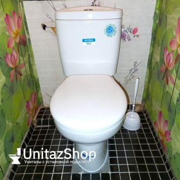 Унитаз-компакт Victoria от Испанского бренда Roca. Конструкция модели самая популярная - бачок устанавливается на полочку унитаза. Выпуск косой. Подвод воды в бак снизу. Система смыва - двухрежимная кнопка на 3 и 6 литра - это удобно и экономно. Стульчак выполнен из дюропласта. Этот материал отличается высокой прочностью и стойкостью к УФ и химическим кислотам. А так же является гигиеничным. По желанию, можно установить функцию микролифт (бесшумное и плавное закрытие крышки). Изготовлен унитаз из качественного сантехнического фарфора, покрытого керамической глазурью.